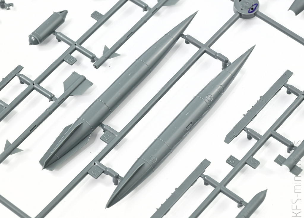 Na tle efektownego modelu maszyny, nieco mniej efektownie wypadają podwieszenia. I nie mam tu na myśli rodzajów uzbrojenia, bo tych F-13 za dużo nie miał do wyboru. Raczej chodzi o te wszystkie zbiorniki paliwa czy wyrzutnie rakiet niekierowanych, które Eduard każe nam sklejać z dwóch połówek. Mamy rok 2025, więc marzenia o formach suwakowych nie są chyba czymś przesadzonym, prawda?