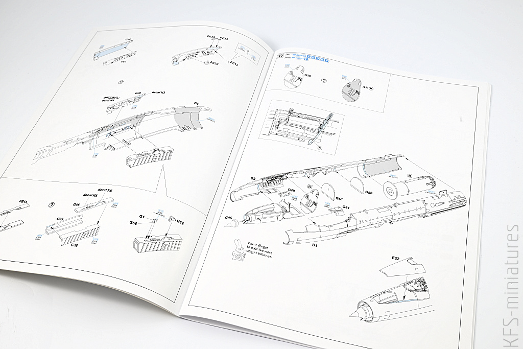 W ogóle patrząc na ilość części i instrukcję montażu nie sposób opędzić się od wrażenia, że Eduard projektując ten zestaw, jednocześnie stworzył model bardzo skomplikowany. Przynajmniej tak to wygląda na tle miniatur odrzutowców w skali 1/48. Oczywiście wszelka opcjonalność, wykonane jako oddzielne części poszczególne mechanizmy, orurowanie czy okablowanie jest fajne, bo ułatwia prace malarskie, to jednak pociąga to za sobą komplikacje w montażu i większe prawdopodobieństwo popełnienia błędów, które mogą wpływać na finalny wygląd modelu. Ale coś za coś. Dla mnie to zdecydowanie zaleta, ale wspominam o tym wszystkim, bo wiem że dla wielu modelarzy im prostszy model, tym lepiej. Tutaj niestety prostoty nie uświadczymy.