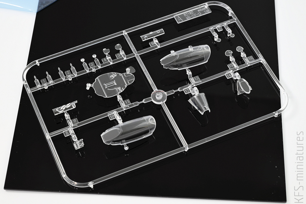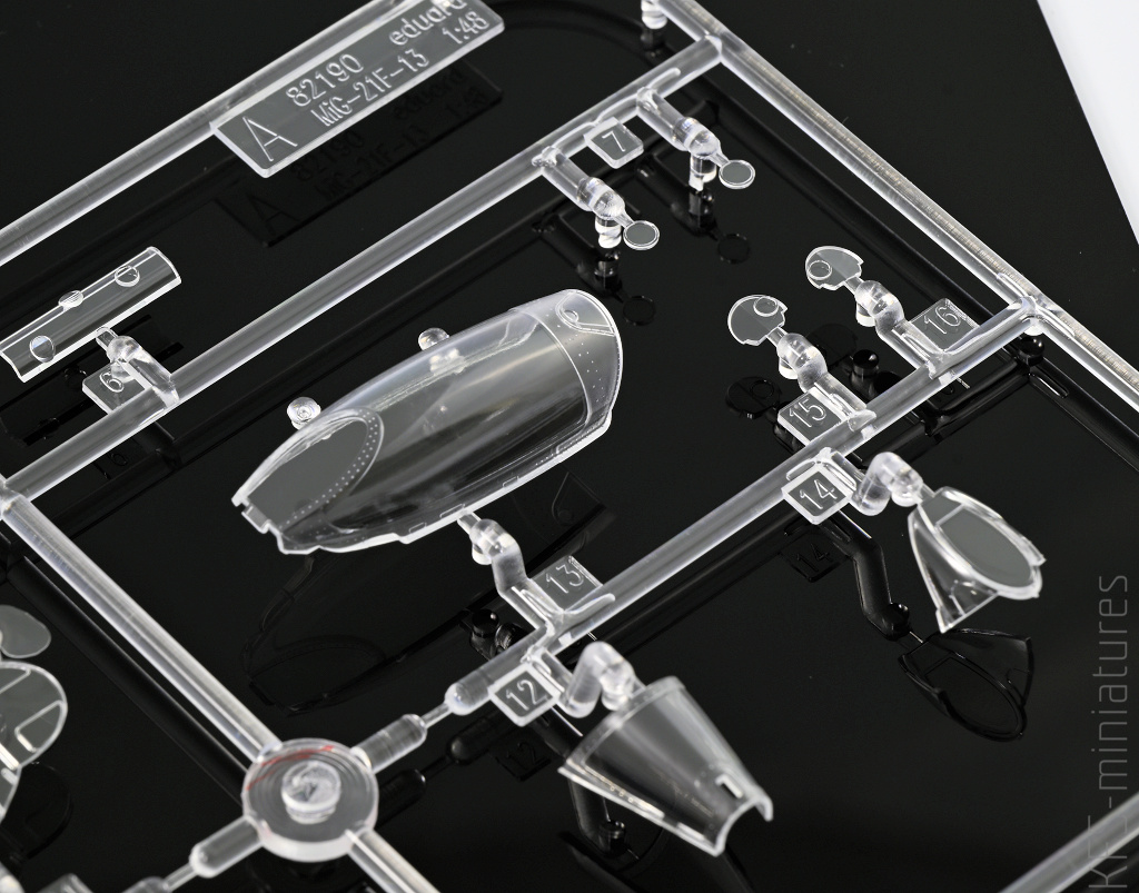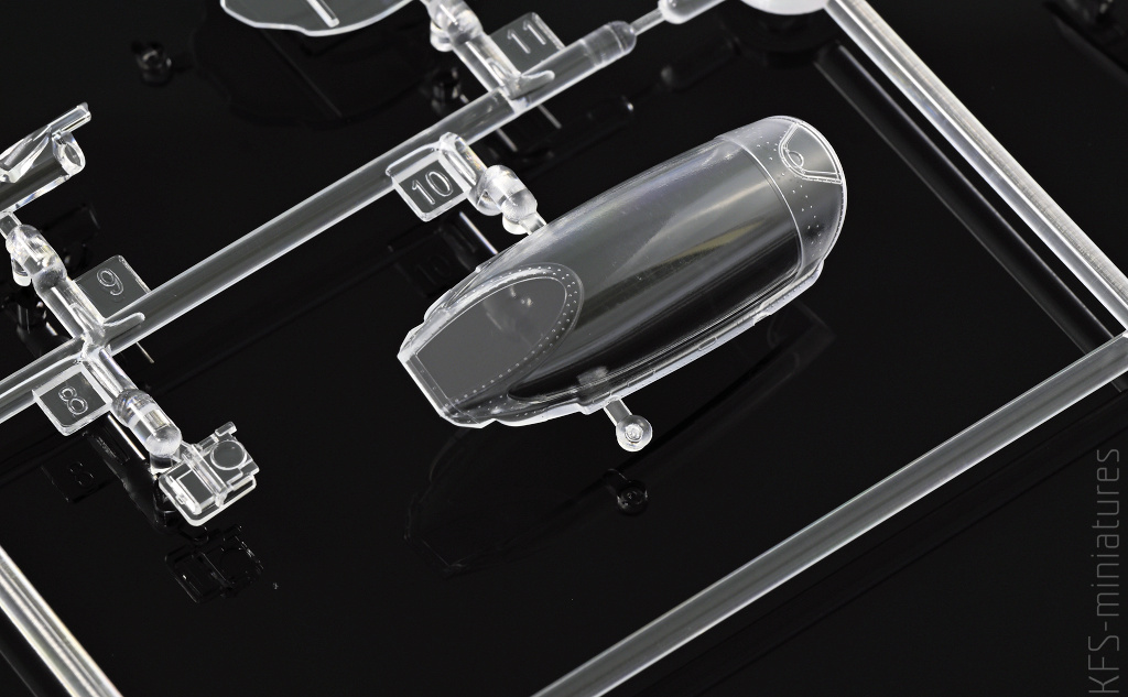 No i jeszcze w temacie opcji – na wyprasce ze „szkłem”, dostajemy dwie wersje owiewki. Jedna z nich służy do prezentacji otwartej kabiny. W sumie to taki drobiazg, bo równie dobrze mogła być jedna, w której wystarczyłoby odciąć drobną wypustkę mocującą, żeby kokpit zamknąć. Ale miło że Eduard daje takie możliwości. Jakby co, w zestawie dostajemy zapasową owiewkę, co może się przydać w kryzysowych sytuacjach. A samo szkło, jak widać na zdjęciu, niemal bez żądnych optycznych zniekształceń. Milutko.