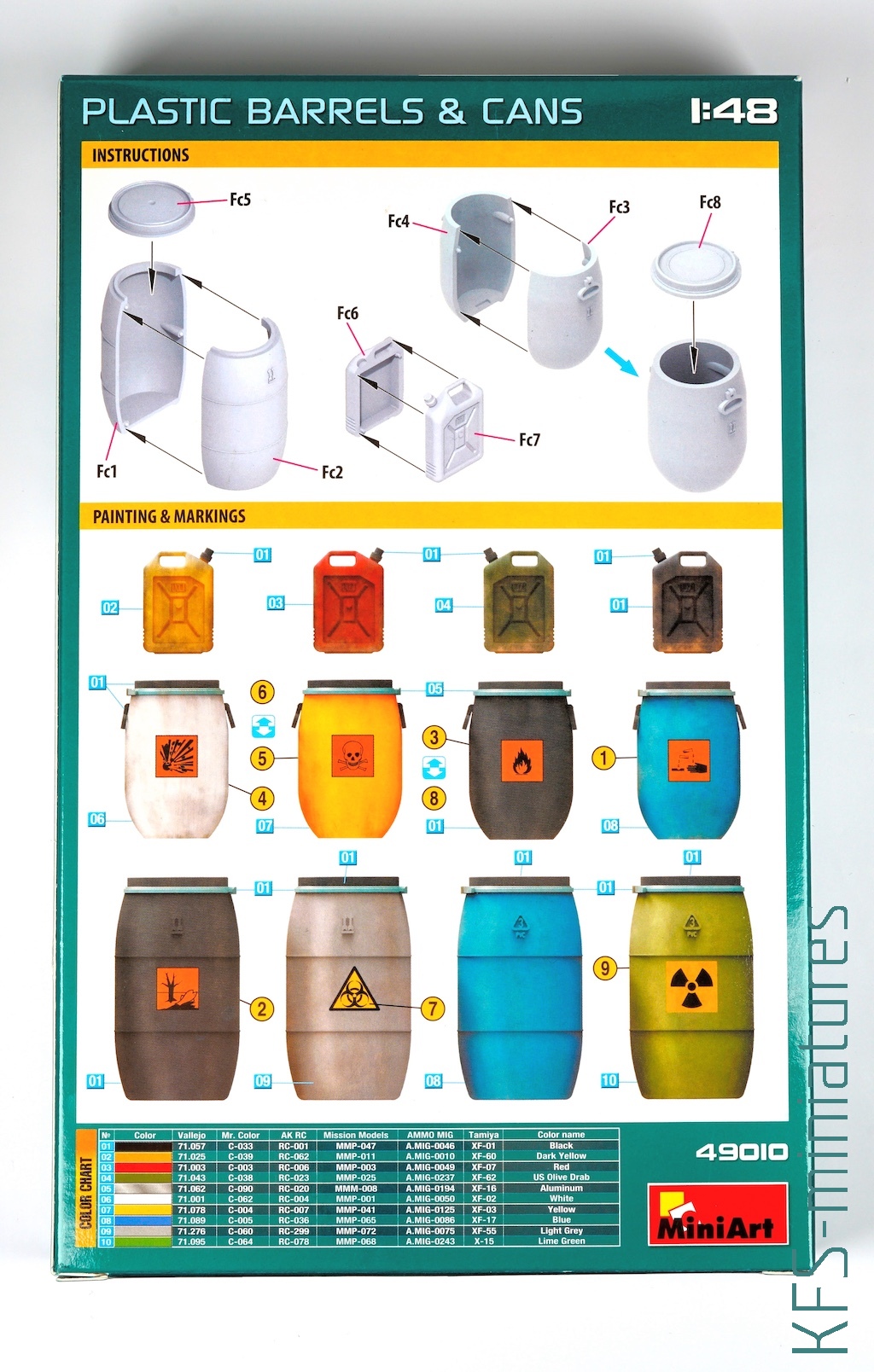 W pudełku nie ma instrukcji. Ta znajduje się na awersie pudełka. I bardzo dobrze, bo w tym przypadku inna opcja byłaby po prostu marnowaniem papieru, ponieważ przedmioty zawarte na wypraskch składają się z 2, max. 3 elementów. Poza opisem rozmieszczenia kalkomanii, mamy tutaj też rozpiskę kolorów w klasycznym dla MiniArtu stylu. Wszystkie kolory są rozpisane na serie farb: Vallejo, Gunze C, AK RC, Mission Models, Ammo Mig oraz Tamiya.