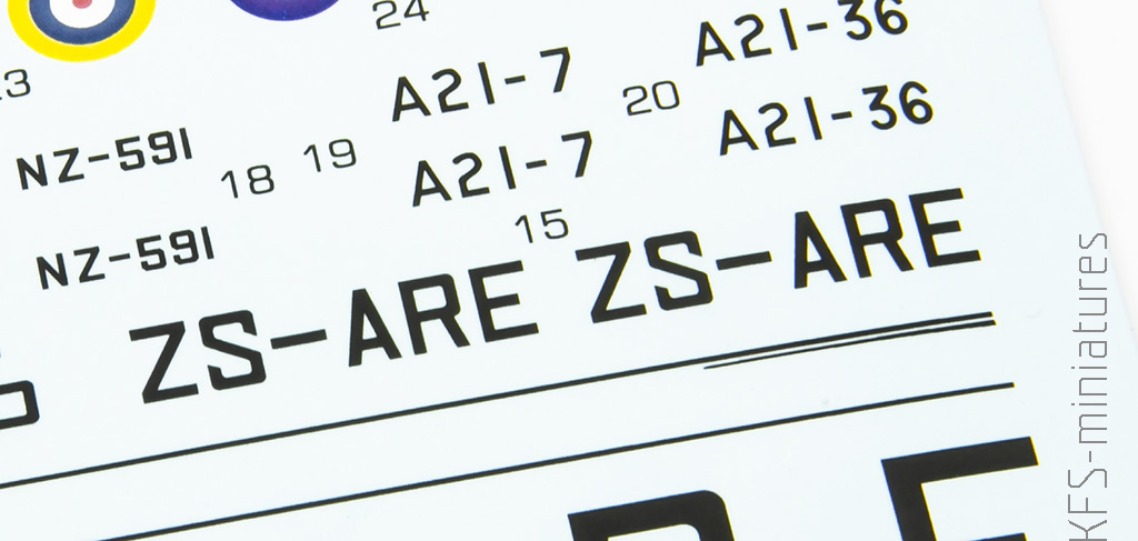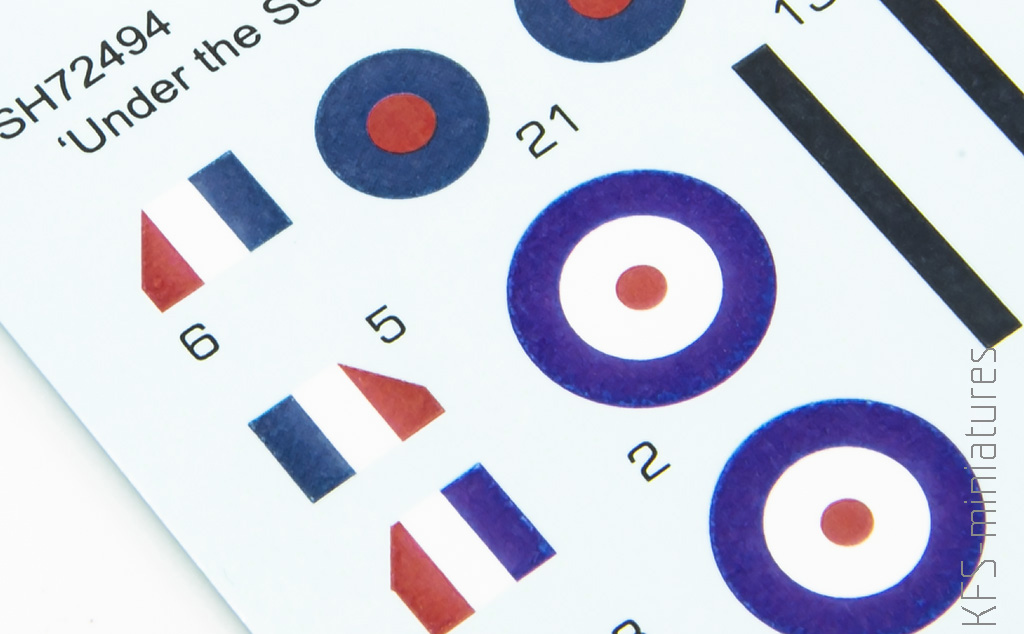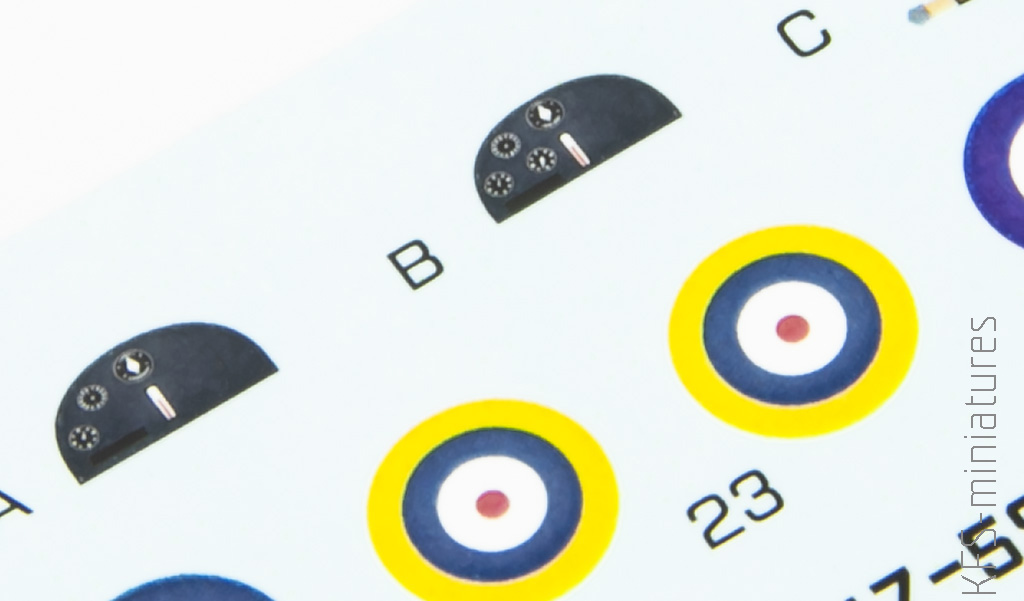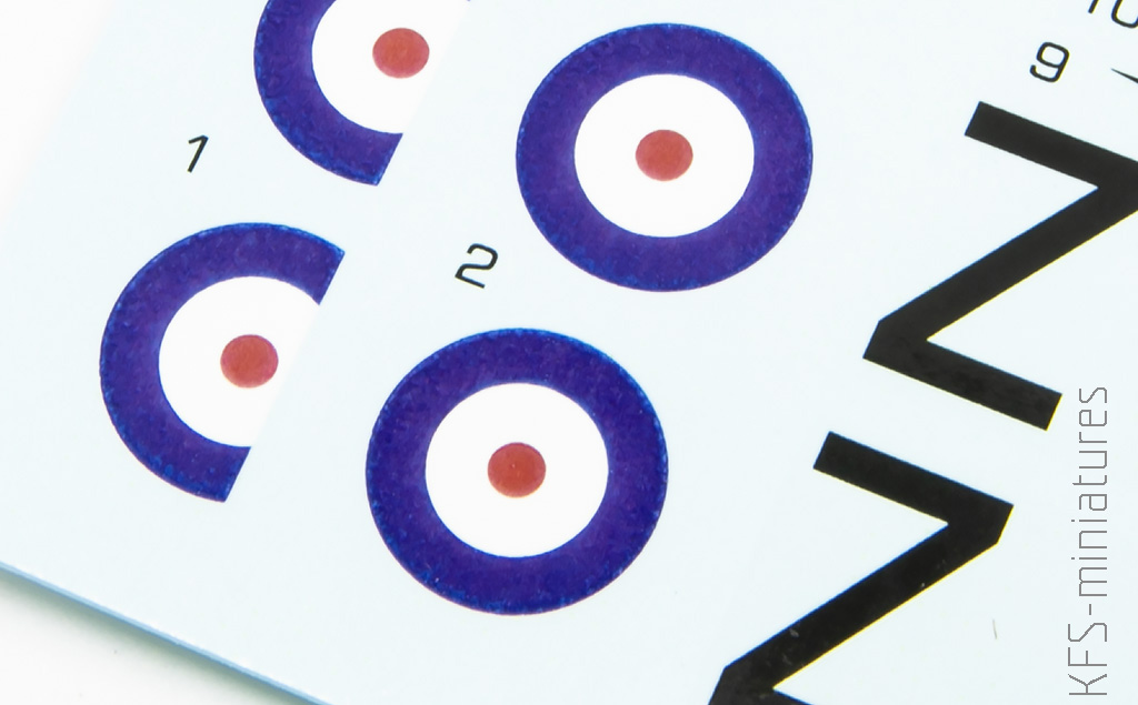 Kalkomania wyraźnie wskazuje na pochodzenie eduardowskie – głównie za sprawą lekko “spranych” kolorów na kokardach. Niemniej, poza tym mankamentem, trudno jej coś zarzucić. Druk jest ładny, ostry i bez wad. Mamy nawet dwie wersje kangura na jeden z samolotów australijskich.