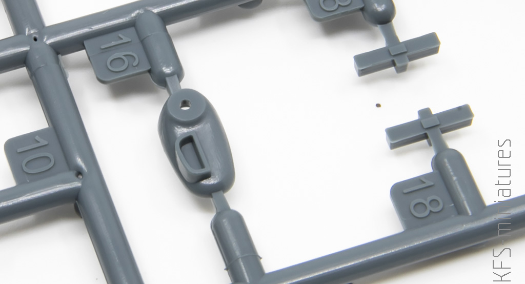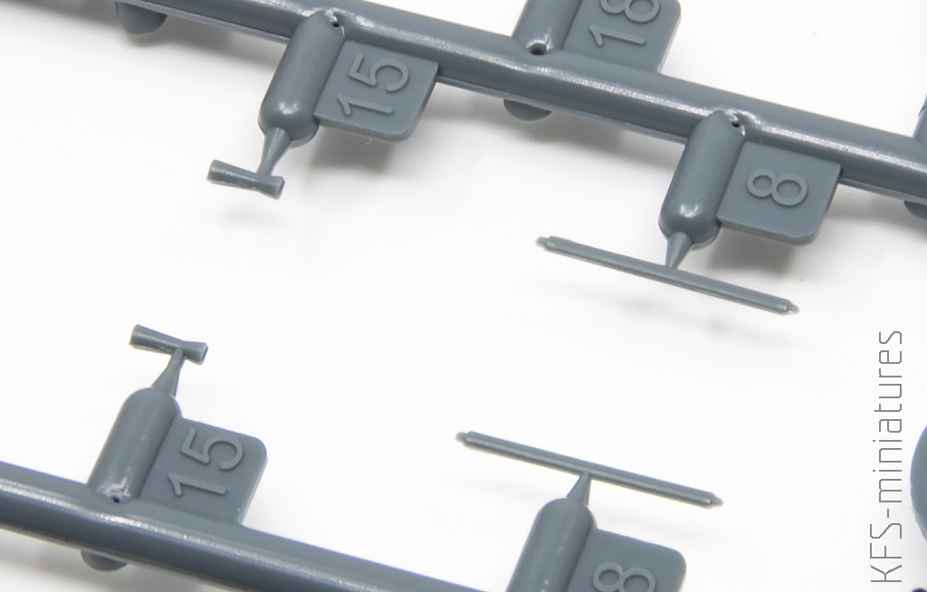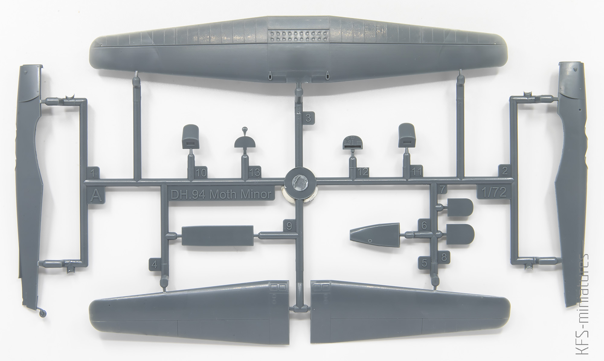 Plastik bardzo przyjemny, bez wad i znaczących nadlewek, czy innych artefaktów wtrysku. Szwy po łączeniu form małe lub ich nie ma wcale. Powierzchnia na dużych elementach bez skaz. Imitacja płótna na powierzchniach sterowych bardzo przyjemna. Jedyne detale to w zasadzie kilka bąbli na osłonie silnika i ażurowa klapa pod centropłatem i kadłubem.