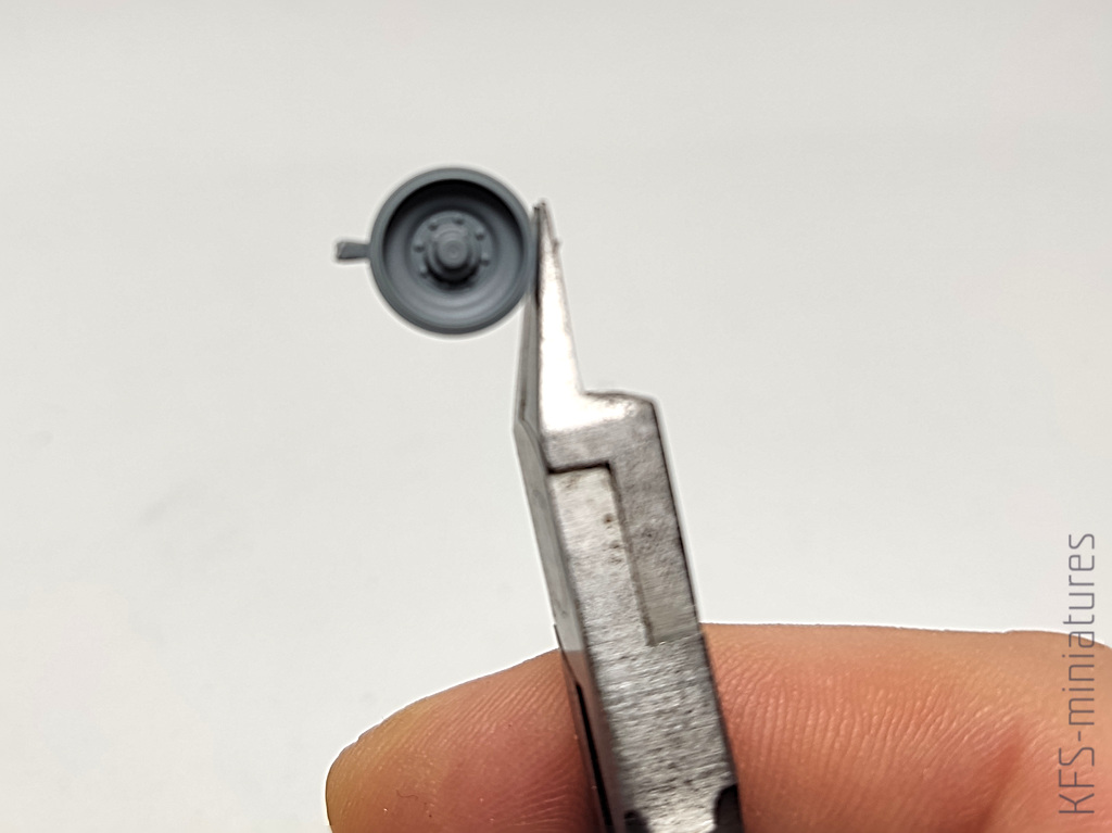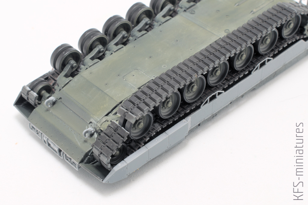 Gdy zabrałem się za montowanie gąsienic na kołach, być może z mojej zamaszystości, wyszło, że brakuje mi kilku ogniw, Mimo uprzedniego sprawdzenia wszystkiego wielokrotnie, jedna gąsienica się nie domykała (żeby domknąć drugą musiałem użyć elementy z tej pierwszej stąd braki na tejże). Oczywiście może to wynikać z mojego braku doświadczenia w temacie lepienia pojazdów pancernych, ale zalecam jednak ostrożność przy składaniu tego podzespołu.