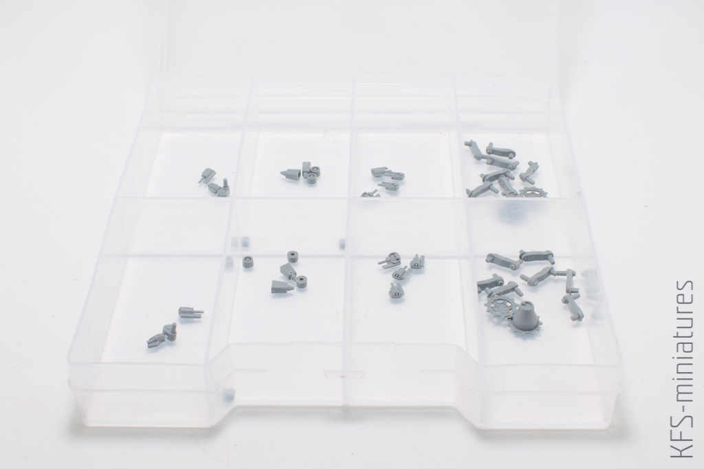 Instrukcja raczej prowadzi nas w dobrej kolejności, dlatego zacząłem od wycięcia podwozia. Pamiętajmy, że to skala 1/72 i te wszystkie osobno wtryśnięte elementy zawieszenia są naprawdę drobne. Dlatego polecam użyć jakiegoś sortera, aby praca mogła iść sprawnie i bez zbędnej walki o części z carpet monsterem!