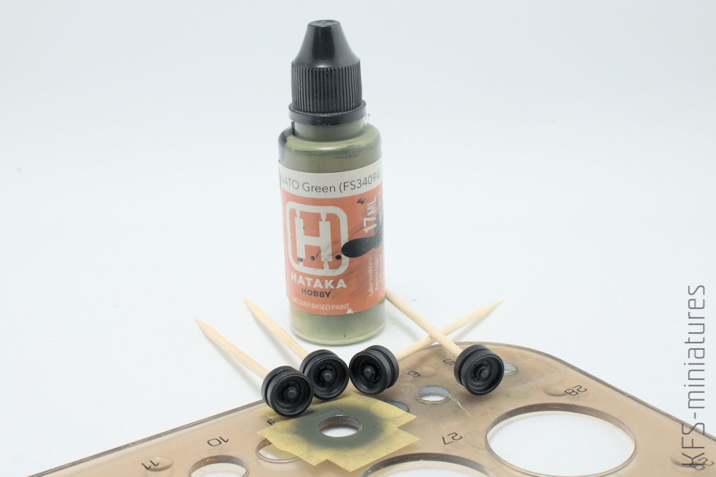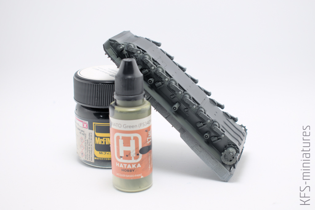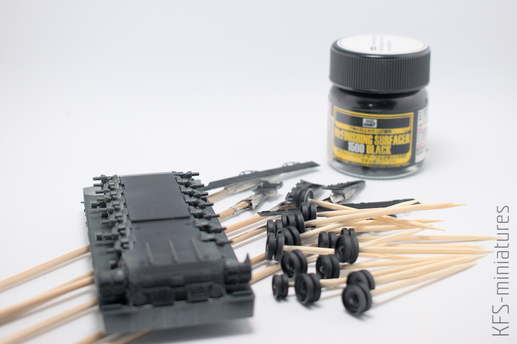 Po wycięciu wszystkich elementów skleiłem zawieszenie w całość. Przed wklejeniem kół i gąsienic, trzeba było wymalować te niedostępne później powierzchnie. Tradycyjnie, zacząłem od czarnego podkładu.
