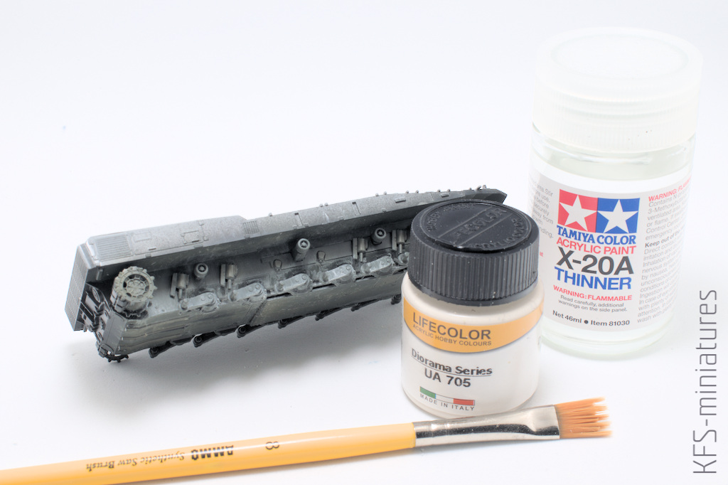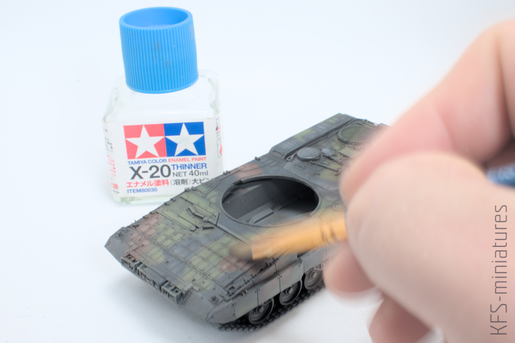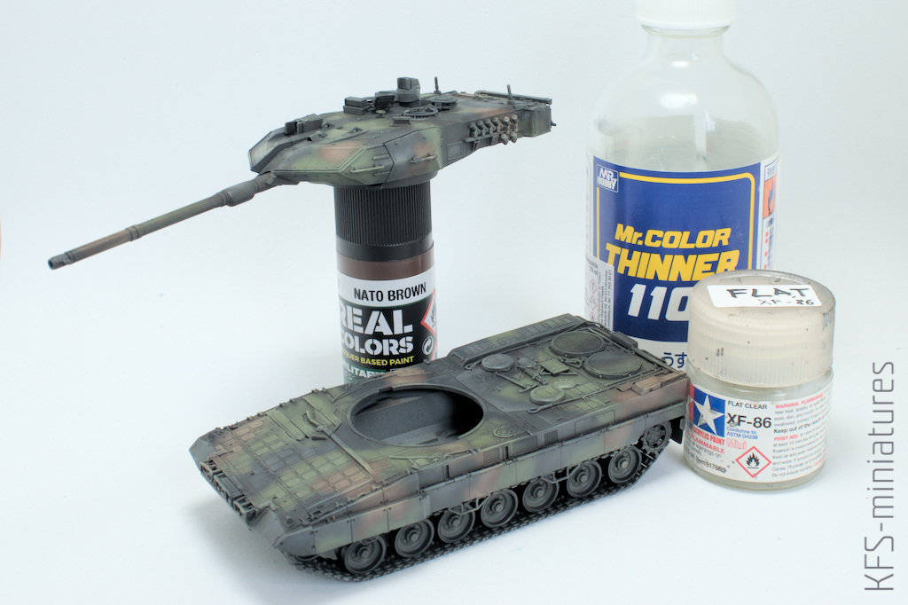 Żeby efekty mojej dotychczasowej pracy nie wytarły się przy dalszych etapach, zabezpieczyłem całość matowym lakierem – dla uzyskania głębokiego matu rozcieńczonym Mr. Color Thinerrem.