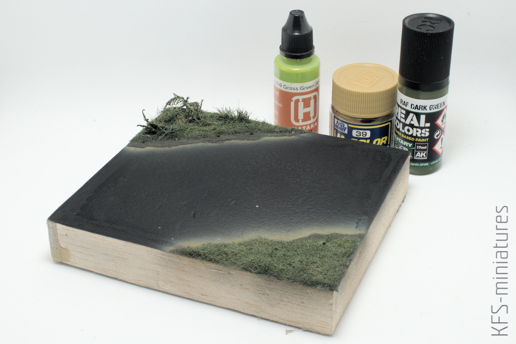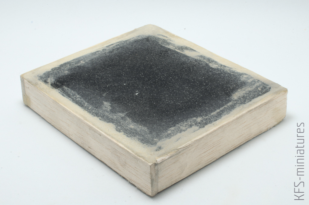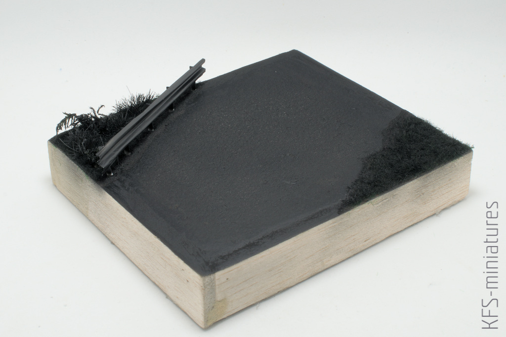 Zgodnie z zasadą, że takie szkraby najlepiej wyglądają jednak na podstawce, od razu zabrałem się za budowanie małej winietki. Kawałek wcześniej pomalowanego styroduru obłożyłem listewkami z balsy i zaszpachlowałem szczeliny.