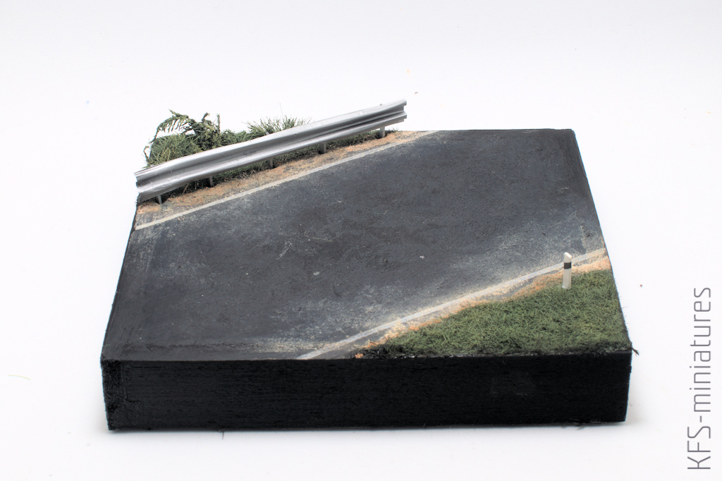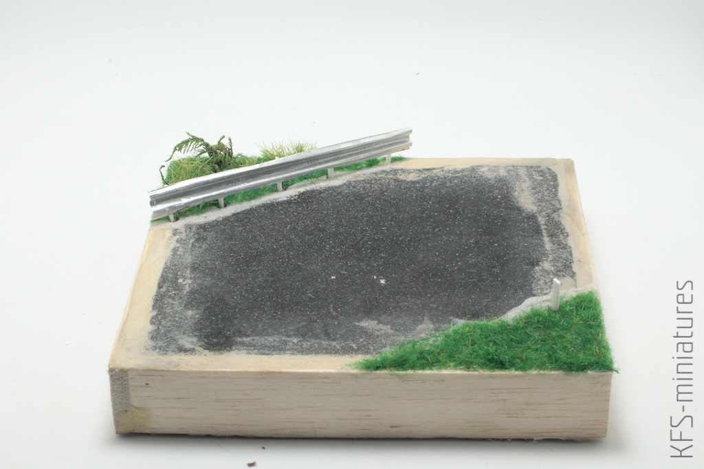Wyznaczyłem jezdnię i ze statycznej trawy i innej flory dodałem pas zieleni. Aby urozmaicić nieco krajobraz, z grubszej foli aluminiowej i kawałklów HIPSu dorobiłęm barierkę energochłonną i słupek.