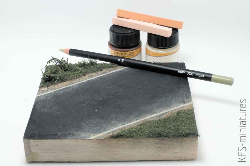 Zakurzyłem jeszcze pobocze i drogę – farbami akrylowymi, pigmentami z kredek i suchych pasteli.